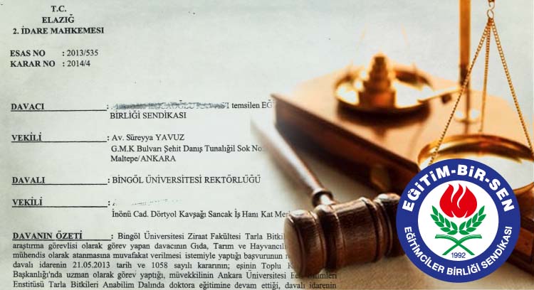 Elazığ 2. İdare Mahkemesi, Bingöl Üniversitesi Ziraat Fakültesi Tarla Bitkileri bölümünde araştırma görevlisi olarak görev yapan Eğitim-Bir-Sen üyesinin, Gıda Tarım ve Hayvancılık Bakanlığı’na mühendis olarak atanmasına muvafakat verilmesi istemiyle yaptığı başvurunun reddine ilişkin dava konusu işlemi, hukuka uygun olmadığı gerekçesiyle, iptal etti.