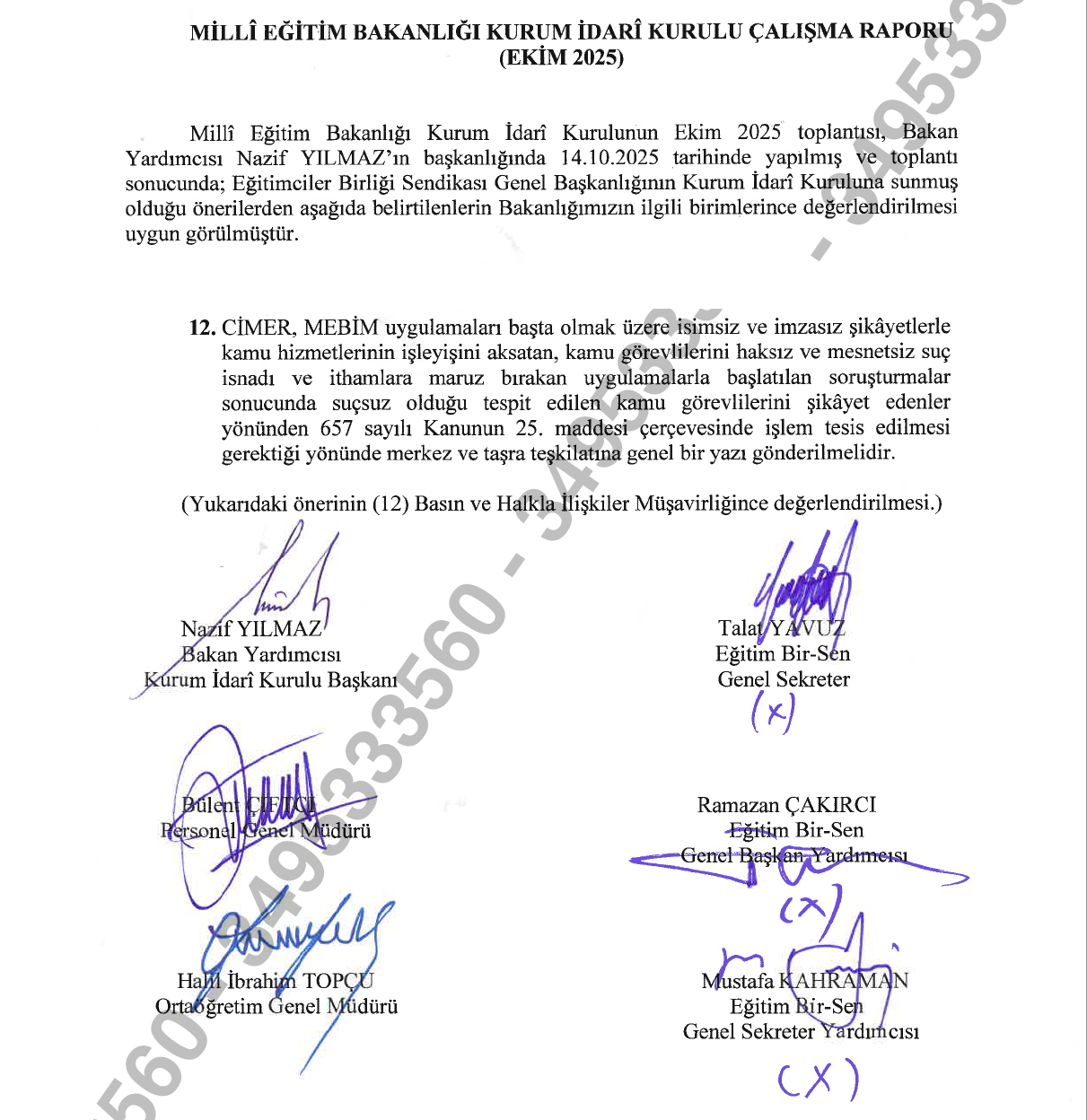 Böylece son olarak MEB KİK Nisan 2025 ve Ekim 2025 toplantılarında ısrarla gündeme taşıdığımız, Ekim 2025 Çalışma Raporu’nda yer verilen “CİMER, MEBİM uygulamaları başta olmak üzere isimsiz ve imzasız şikâyetlerle kamu hizmetlerinin işleyişini aksatan, kamu görevlilerini haksız ve mesnetsiz suç isnadı ve ithamlara maruz bırakan uygulamalarla başlatılan soruşturmalar sonucunda suçsuz olduğu tespit edilen kamu görevlilerini şikâyet edenler yönünden 657 sayılı Kanunun 25. maddesi çerçevesinde işlem tesis edilmesi gerektiği yönünde merkez ve taşra teşkilatına genel bir yazı gönderilmelidir” şeklindeki talebimiz yerine gelirken, ciddi bir soruna da çözüm getirilmiş olacak.